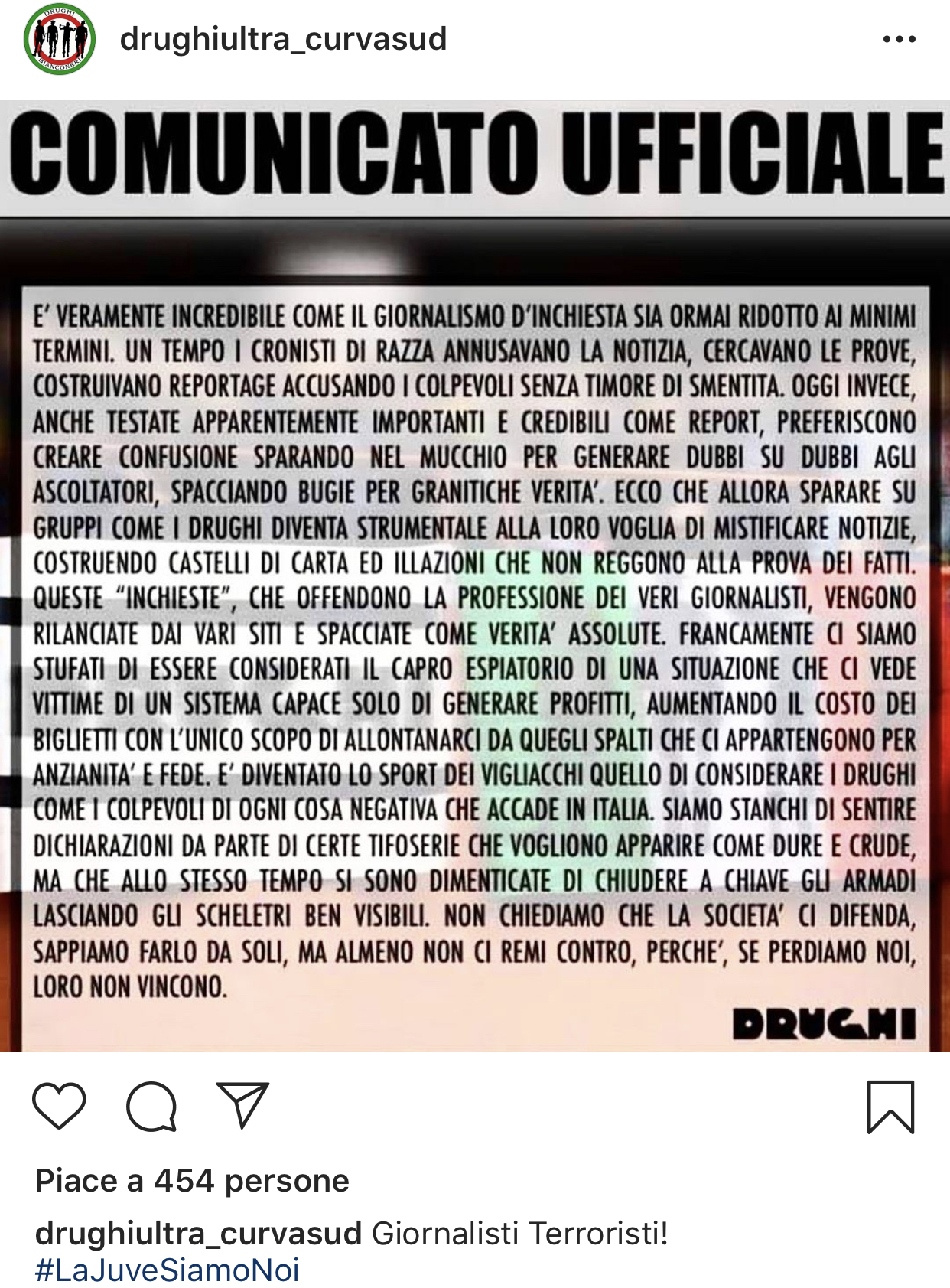 Il gruppo organizzato di tifosi bianconeri “Drughi” ha da poco diramato un comunicato ufficiale sul proprio profilo ufficiale di Instagram.
