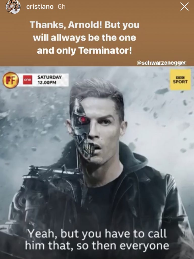 Arnold Schwarzenegger ieri sera è intervenuto alla BBC dove ha parlato di quello che è stato il personaggio forse più importante della sua carriera cinematografica: Terminator. L’attore ha difatti ricordato come, mentre nell’NBA è stato associato il soprannome di Terminator ad una giocatore, questo finora invece non è successo nel calcio. Per questo “Schwarzy” ha proposto di eleggere Cristiano Ronaldo come “Terminator” del pallone. Non si è però fatta attendere molto la risposta del fenomeno portoghese che ha subito postato su Instagram il video dell’intervento dell’attore aggiungendo un emblematico: “Grazie Arnold! Solo tu sei l’unico Terminato!”.