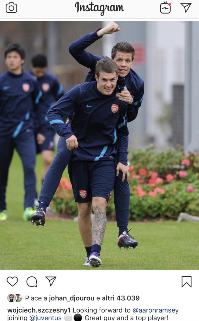 il cui passaggio alla Juventus fissato per Giugno è stato ufficializzato da poche ore. L’estremo difensore polacco ha giocato per diverse stagioni con l’asso gallese ed ha postato subito una foto che ritraei i giovanissimi Szczesny e Ramsey prima di un allenamento con l’Arsenal commentandolo in questo modo: “Aspettando che Aaron Ramsey arrivi alla Juventus. Bravo ragazzo e top player!”.