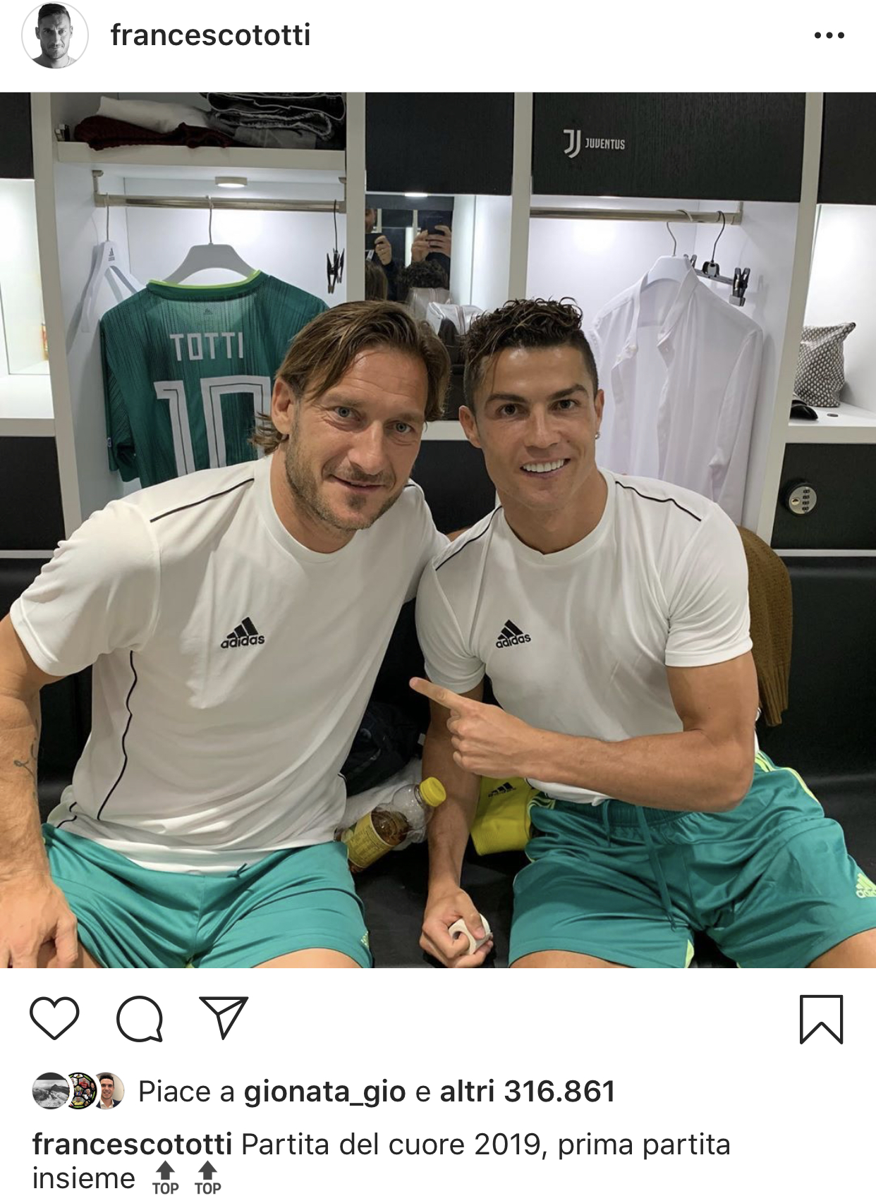 E’ terminata da pochissimi minuti la partita di beneficienza disputata all’Allianz Stadium che, tra i tanti protagonisti, ha visto impegnati l’idolo indiscusso di casa Cristiano Ronaldo ed uno dei giocatori italiani più forti di tutti i tempi, Francesco Totti. Proprio la bandiera giallorossa, prima dell’inizio dell’incontro ha postato sul proprio profilo Instagram una foto al fianco del fenomeno portoghese che ha infiammato i tifosi sui social network.