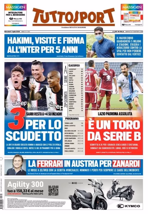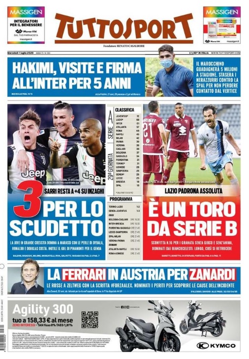 TORINO- Tuttosport in edicola oggi apre parlando del rotondo successo della Juventus a Genova, scaturito da tre splendide reti di Dybala, Cristiano Ronaldo e Douglas Costa. Bianconeri che restano così a +4 sulla Lazio, vincitrice nel primo pomeriggio in casa del Torino, che ora deve stare attento alla zona rretrocessione. In casa Inter, intanto, c’è la firma di Hakimi, colpo in risposta all’arrivo di Arthur alla corte di Sarri:
