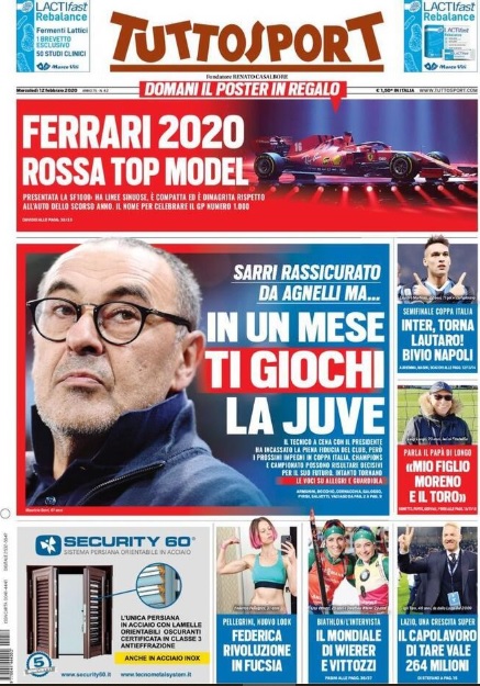 TORINO- Nella prima pagina di Tuttosport in edicola oggi c’è spazio per Maurizio Sarri. Il mister toscano, che ha ricevuto la fiducia di Agnelli, si gioca il futuro alla Juventus con i prossimi impegni, mentre tornano a farsi insistenti le voci su Allegri e Guardiola. Spazio anche per l’Inter, che con il Napoli in copa Italia ritroverà Lautaro, e per il Torino, con un’intervista al padre del nuovo tecnico Longo. Infine, focus sulla Ferrari, che ieri ha presentato la nuova SF1000.
