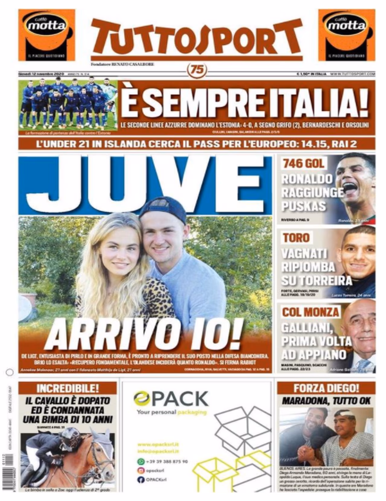 TORINO- La prima pagina di Tuttosport in edicola oggi apre parlando dell’imminente ritorno in campo di Matthijs De Ligt. L’olandese tornerà in campo dopo la sosta e, intanto, riceve i complimenti dell’ex bianconero Sergio Brio. Spazio anche per il record di 746 gol in carriera di Ronaldo e per la convincente vittoria dell’Italia, che con un sonoro 4-0 ha superato in amichevole l’Estonia. Ma attenzione perché, proprio in queste ultimissime ore, è arrivata anche una grossa novità di mercato in casa bianconera. Ci risiamo: clamoroso ritorno di fiamma per un nome pesantissimo! >>>VAI ALLA NOTIZIA