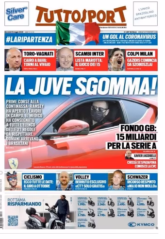 TORINO- Sulla prima pagina di Tuttosport in edicola oggi è la Juventus ad essere protagonista. Il club bianconero ha aperto ieri i cancelli del JTC per gli allenamenti individuali, con Aaron Ramsey tra i primi a scendere nuovamente in campo, mentre i medici hanno consegnato ai calciatori la lista delle 21 regole da rispettare. Attesi per domani anche i ritorni dei calciatori brasiliani, al momento in quarantena in Sudamerica. Grande spazio, poi, viene dato al mercato delle due milanesi: