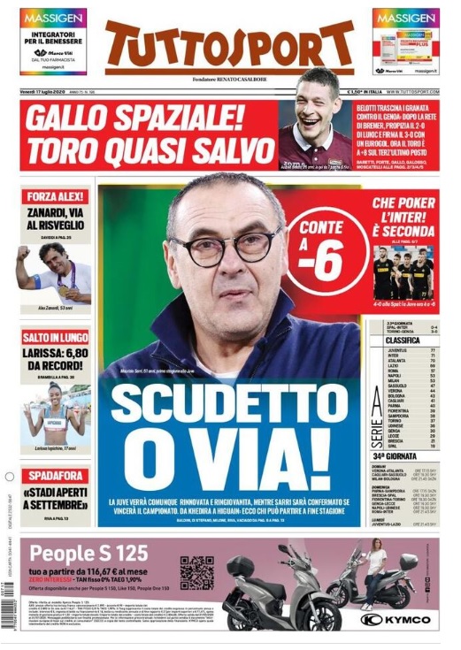 TORINO- L’edizione odierna di Tuttosport si apre parlando della situazione in casa Juve. I bianconeri preparano la rivoluzione per il finale di stagione, con anche Sarri sul banco degli imputati. Solo in caso di successo in campionato, infatti, il tecnico verrà confermato. Intanto, con il successo sulla Spal, l’Inter si rifà sotto in classifica, portandosi a -6 da Ronaldo e compagni. Il Toro, grazie a Belotti, fa un passo in avanti verso la salvezza: