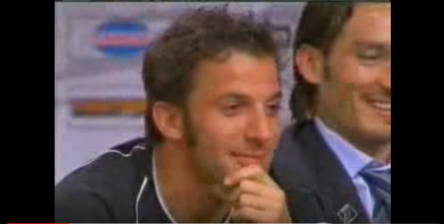 Alessandro Del Piero, decisamente brillo per i festeggiamenti dello scudetto, si diverte ad imitare Sandro Piccinini durante la diretta con il programma-tv di Italia 1 “Controcampo”. Il capitano della Juventus imita i tipici gesti del conduttore.