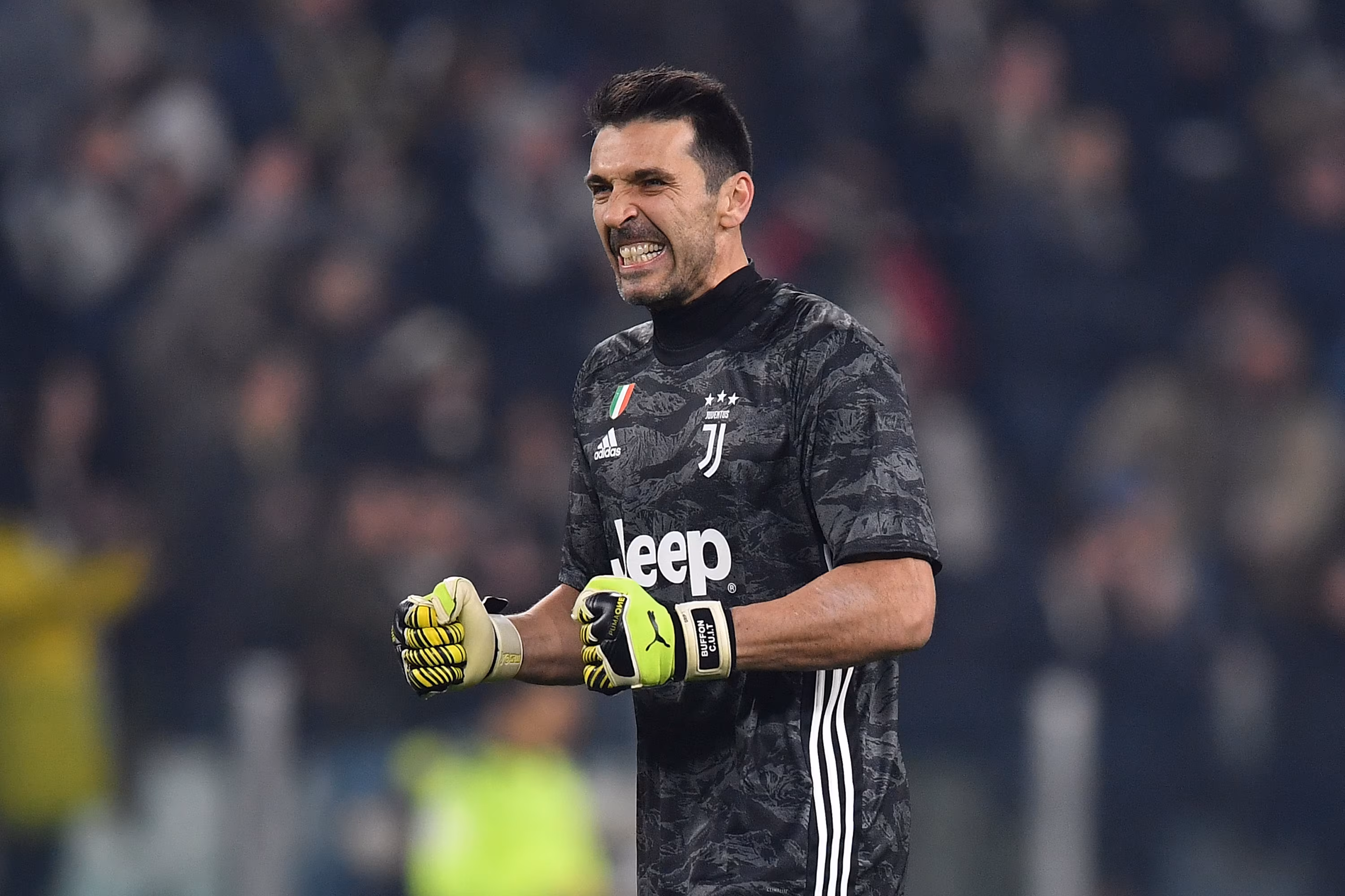 Gigi Buffon esulta con la maglia della Juventus