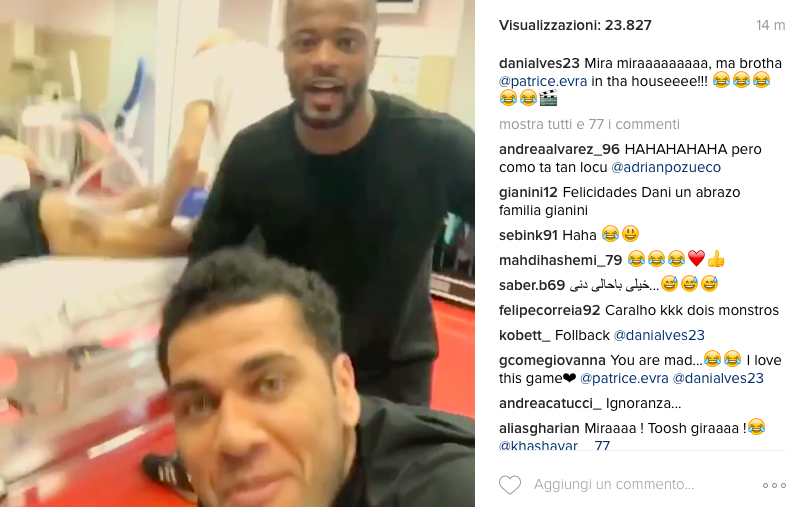 TORINO – È tornato per salutare tutti, compagni di squadra, staff tecnico e staff medico. Dopo l’addio, Patrice Evra è voluto tornare a Vinovo per rivedere i suoi vecchi amici ed è stato ripreso da Dani Alves, chi in quel momento era il sala massaggi prima dell’allenamento di oggi. L’arrivo di Evra ha scatenato il brasiliano, che prima lo ha chiamato ripetutamente, poi insieme a lui ha recitato il motto del francese “I love this game”. E via con le risate a più non posso.