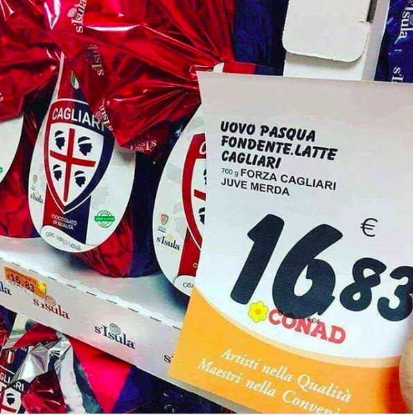 TORINO – Nonostante manchi ancora quasi un mese alla Pasqua, nei supermercati di tutta Italia sono già in vendita le tradizionali uova di cioccolato. In Sardegna però c’è un “Uovo speciale” che sta facendo discutere il mondo dei social. “Forza Cagliari, Juve me**a” questo l’etichetta che appare in un supermercato sardo collegata all’Uovo di Pasqua dei rossoblu. Un gesto che farà sicuramente discutere, anche se ancora non si riesce a capire se si tratti di un fotomontaggio o meno. Comunque sia, gli anti-juventini ne hanno subito approfittato per farsi due risate.