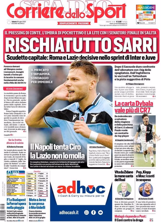 TORINO – Il Corriere dello Sport di oggi parla nel taglio alto della Juventus: “Rischiatutto Sarri” il pressing di Conte, l’ombra di Pochettino e la lite con i senatori. Finale in salita. Scudetto capitale: Roma e Lazio decisive nello sprinti di Inter e Juve. Dopo il Sassuolo duro confronto dell’allenatore con i big dello spogliatoio. Dall’Inghilterra le voci sull’ex Tottenham e la voce suggestiva di Pirlo.”