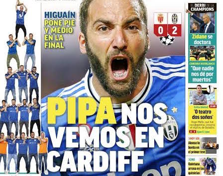 TORINO – La doppietta di Gonzalo Higuain allo Stade Louis II proietta la Juventus verso la finale di Champions del tre giugno a Cardiff. Anche Marca questa mattina ha esaltato la prestazione di Higuain, che è stato assoluto protagonista nella vittoria della Juve sul Monaco. “Pipa, ci vediamo a Cardiff” questo il titolo del giornale, da sempre vicino alla vicende del Real Madrid, che prevede per il Monaco “un’impresa impossibile, visto che da novembre la Juventus non subisce gol in Champions League”.