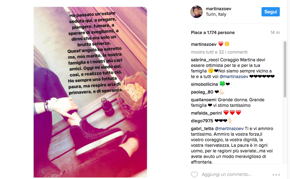 TORINO – Un’estate infernale, la malattia del piccolo Matteo che ha cambiato la vita della famiglia Bonucci, che ha ricevuto tanti messaggi di supporto da tutta Italia. I tifosi di tutte le squadre hanno dimostrato la loro solidarietà verso la famiglia di Leonardo Bonucci per la malattia di Matteo, che fortunatamente è guarito nel giro di qualche settimana. Pochi minuti fa su Instagram la moglia di Bonucci, Martina Maccari, ha postato una foto su Instagram molto toccante dove ha ricordato la difficile estate passata al fianco di suo marito: “Ho passato un’estate seduta qui, a pregare, piangere, fumare, a sperare di svegliarmi, a dirmi che era solo un brutto scherzo. Quest’angolo ha sorretto me, mio marito, la nostra famiglia e i nostri più cari amici. Oggi mi siedo qui, così, e realizzo tutto ciò. Ho sempre una fottuta paura, ma respiro aria di primavera, e di speranza”