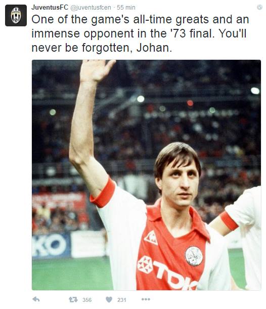 La Juventus ha ricordato sul suo profilo twitter ufficiale Johan Cruijff, campione olandese deceduto oggi