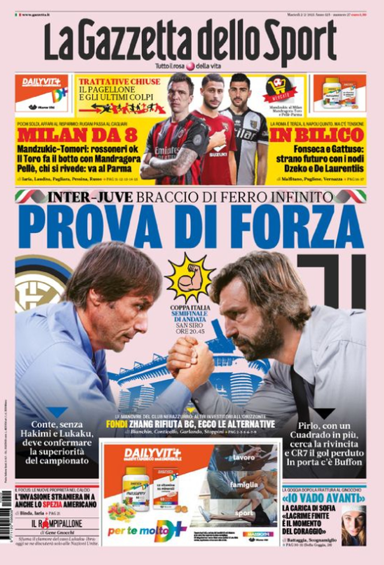 TORINO- La finestra di calciomercato invernale si è chiusa ieri. Diversi i colpi effettuati dai club di Serie A, anche se le grandi squadre hanno pensato maggiormente alle cessione come la Juventus, che in un solo colpo ha piazzato Khedira all’Hertha Berlino (titolo definitivo), Rugani al Cagliari (prestito secco) e Mandragora al Torino (prestito con diritto di riscatto). I bianconeri devono ora pensare al campo. Questa sera, a “San Siro”, andrà infatti in scena il “derby d’Italia” contro l’Inter, una classica del nostro calcio valevole per l’andata delle semifinali di Coppa Italia. Una sfida, quella tra Pirlo e Conte, che occupa le prime pagine della Gazzetta dello Sport e di Tuttosport oggi in edicola: