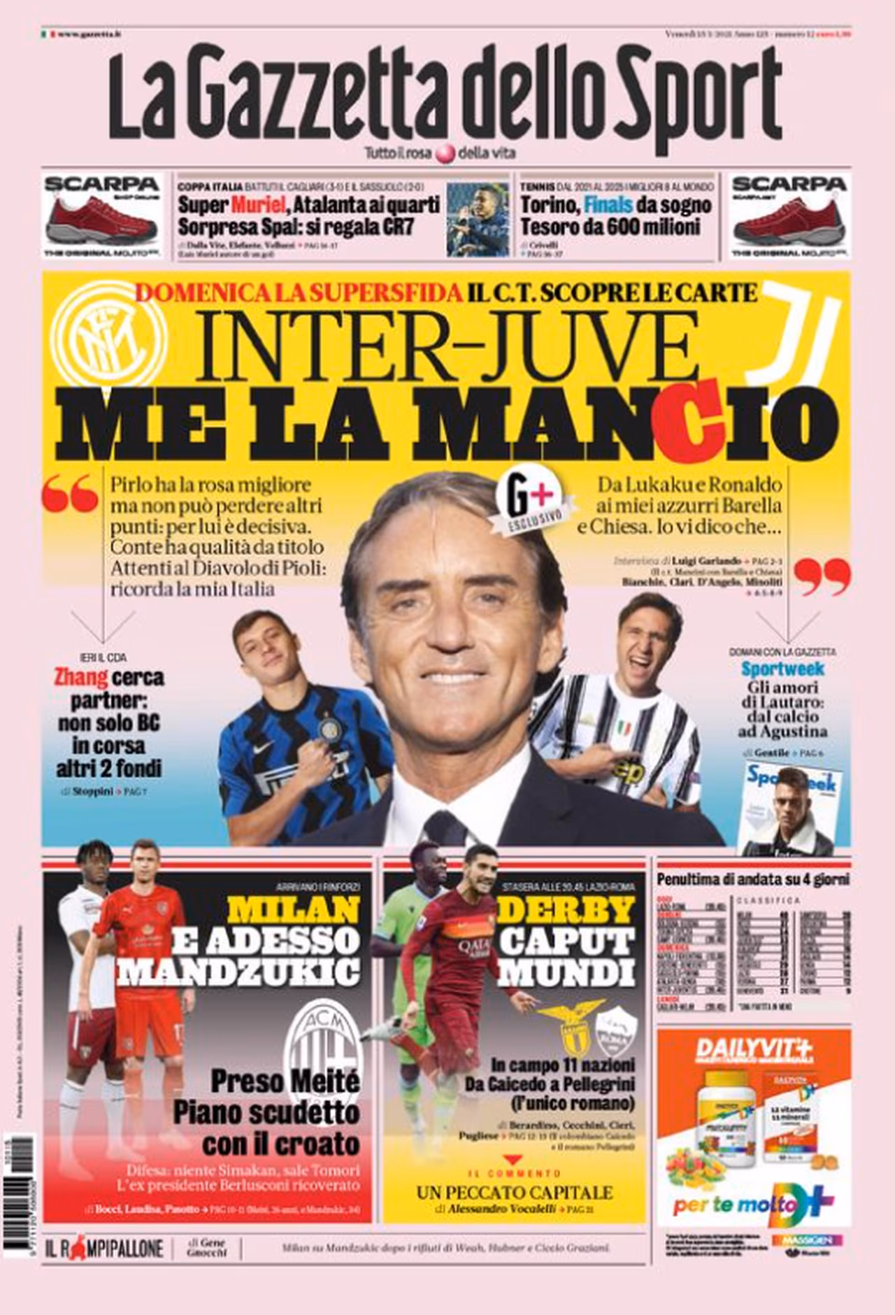 Intervista in esclusiva al ct della Nazionale Roberto Mancini, che analizza così la sfida, parlando poi di lotta scudetto: “Pirlo ha la rosa migliore ma non può perdere altri punti: per lui è decisiva. Conte ha qualità da titolo. Attenti al Diavolo di Pioli: ricorda la mia Italia”. Parlando poi sempre di Inter, il presidente Zhang è in cerca di partner: in corsa non solo i britannici della BC, ma anche altri due fondi. Capitolo mercato: il Milan mette a segno l’acquisto di Meité dal Torino e, in ottica scudetto, punta ora a mettere sotto contratto Mario Mandzukic. L’ex juventino è al momento svincolato e rappresenterebbe un’alternativa di livello ai titolari d’attacco. Analisi sul derby della capitale: 11 Nazionali in campo e un solo romano in campo (Lorenzo Pellegrini).