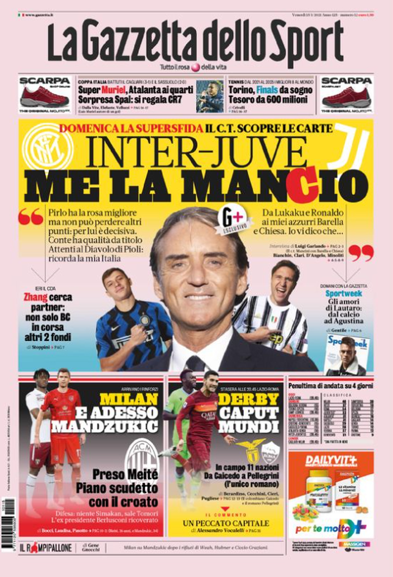 Intervista in esclusiva al ct della Nazionale Roberto Mancini, che analizza così la sfida, parlando poi di lotta scudetto: “Pirlo ha la rosa migliore ma non può perdere altri punti: per lui è decisiva. Conte ha qualità da titolo. Attenti al Diavolo di Pioli: ricorda la mia Italia”. Parlando poi sempre di Inter, il presidente Zhang è in cerca di partner: in corsa non solo i britannici della BC, ma anche altri due fondi. Capitolo mercato: il Milan mette a segno l’acquisto di Meité dal Torino e, in ottica scudetto, punta ora a mettere sotto contratto Mario Mandzukic. L’ex juventino è al momento svincolato e rappresenterebbe un’alternativa di livello ai titolari d’attacco. Analisi sul derby della capitale: 11 Nazionali in campo e un solo romano in campo (Lorenzo Pellegrini).