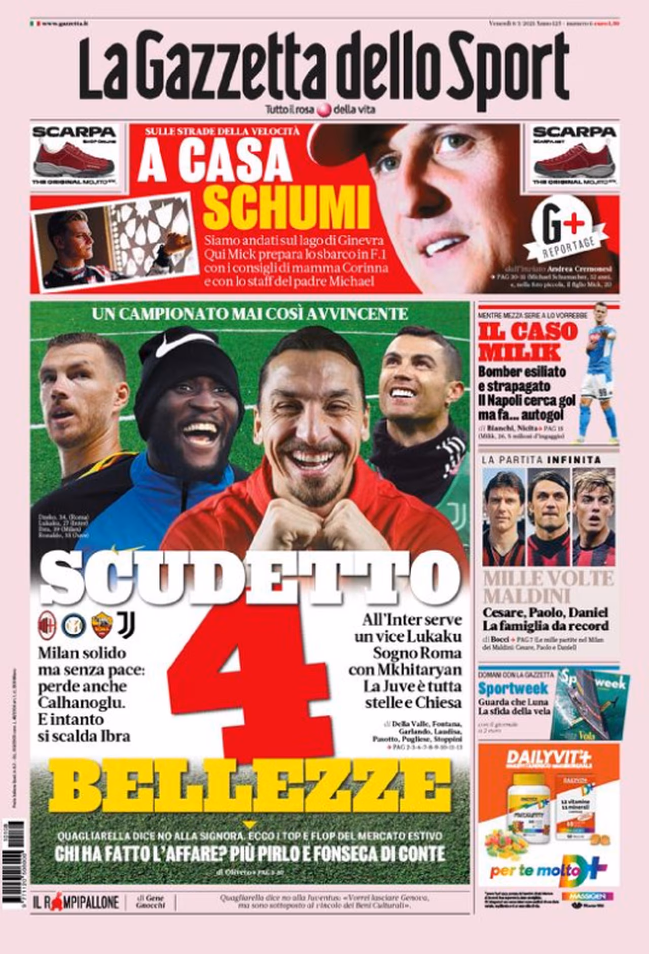Sulla prima pagina della Gazzetta dello Sport in edicola oggi ci si concentra proprio sulla corsa al tricolore. Un campionato mai così avvincente secondo la “rosea”, che vede tra i suoi protagonisti grandi bomber come Cristiano Ronaldo, Zlatan Ibrahimovic, Edin Dzeko e Romelu Lukaku. Spazio poi al mercato, vista la riapertura della finestra dei trasferimenti fino al termine di questo mese. La Juve deve rinunciare al ritorno all’ombra della Mole di Fabio Quagliarella, che con un post su Instagram ha giurato eterna fedeltà alla Sampdoria. Bianconeri che continuano la caccia ad una punta, così come l’Inter, in cerca di un vice-Lukaku. Tra gli obiettivi c’è Arkadiusz Milik, in rotta con il Napoli e in cerca di una nuova sistemazione già nelle prossime settimane. Intanto, Pioli deve fare i conti con l’indisponibilità di Calhanoglu verso la gara con il Torino, mentre la Roma sogna grandi traguardi trascinata da Mkhitaryan.