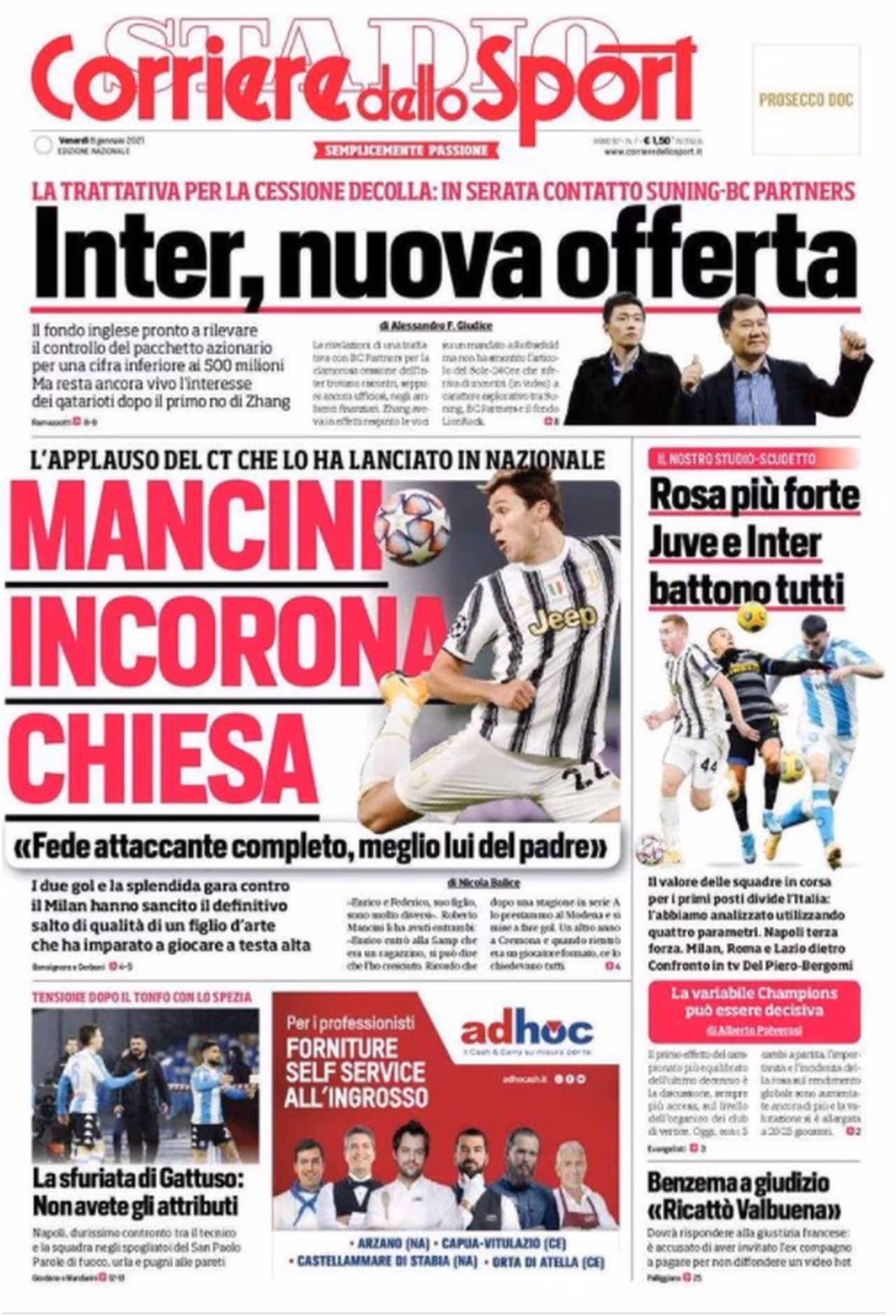 Il Corriere dello Sport in edicola quest’oggi concentra le sue attenzioni sull’uomo del momento: Federico Chiesa. Il numero 22 della Juventus, mettendo a segno una doppietta, è risultato fondamentale per il successo della banda Pirlo sul Milan mercoledì sera. Una vera e propria incoronazione arriva dal ct della Nazionale Roberto Mancini, che lo descrive come un attaccante completo, addirittura già più forte di quanto non fosse suo padre Enrico. Il salto di qualità, per l’ex Fiorentina, è romai dietro l’angolo e un posto per Euro2021 appare sempre più probabile. Spazio poi alla situazione in casa Inter. Il fondo inglese BC Partners, infatti, sarebbe pronto a rilevare la società con un’offerta da poco meno di 500 milioni di euro, anche se resta viva l’ipotesi di una proprietà qatariota dopo il primo no di Zhang. Studio sul valore delle rose di Serie A, mentre Gattuso striglia il suo Napoli dopo il brutto ko interno con lo Spezia.