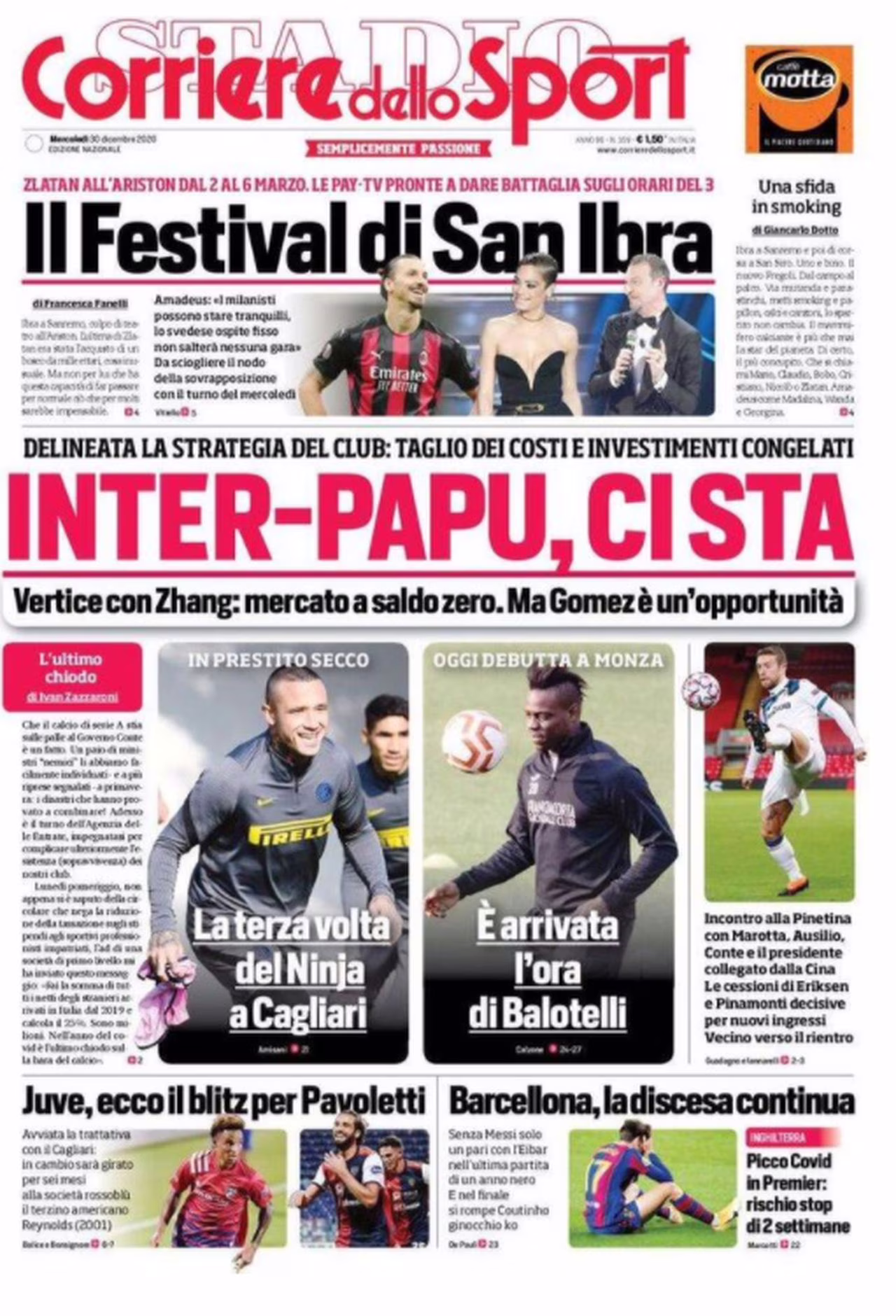 Il Corriere dello Sport in edicola oggi si apre con la partecipazione di Zlatana Ibrahimovic al prossimo “Festival di Sanremo”. Il centravanti del Milan, come annunciato da Amadeus, sarà presente dal 2 al 6 Marzo, senza saltare alcuna partita in programma con i rossoneri. In casa Inter, intanto, ieri è andato in scena un summit tra Conte e la dirigenza per discutere del mercato. Via Nainggolan, tornato in prestito al Cagliari, i nerazzurri faranno una sessione acquisti low cost, sneza però scartare eventuali occasioni come quella di mettere sotto contratto il Papu Gomez in uscita dall’Atalanta. La Juve, intanto, lavora all’arrivo di Pavoletti come vice-Morata. In cambio, al Cagliari, potrebbe essere girato il cartellino del giovane terzino Bryan Reynolds, in arrivo dall’FC Dallas. Calcio estero: crisi nera per il Barcellona, che non va oltre il pari al Camp Nou con l’Eibar.