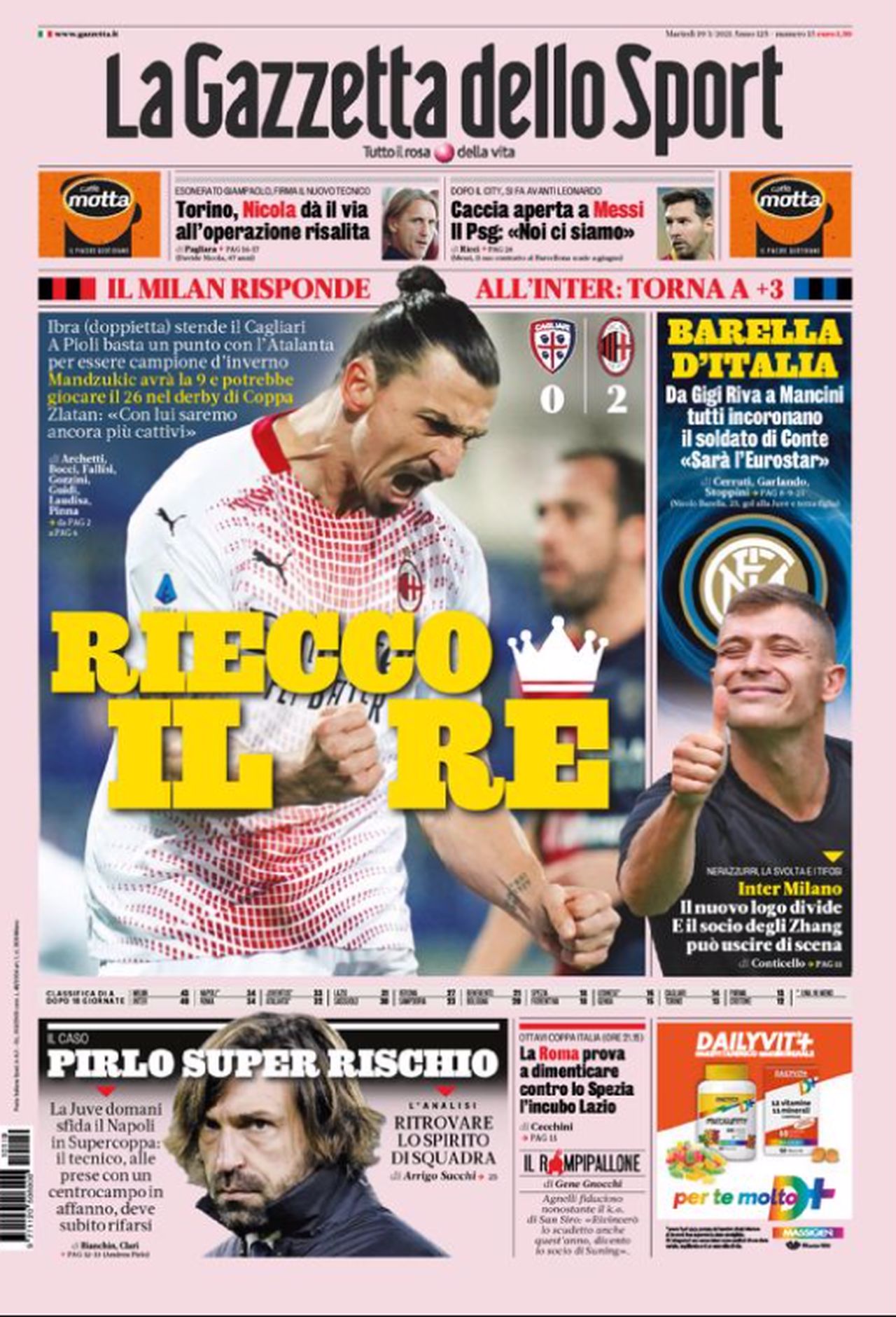 Grande risalto all’ennesimo successo della stagione rossonera sulla prima pagina della “Gazzetta dello Sport”. Ibrahimovic con una doppietta inguaia il Cagliari, sempre più in crisi. Ora, alla squadra di Pioli, basta un solo punto contro l’Atalanta per laurearsi campione d’inverno. Intanto è ufficiale l’arrivo dell’ex juventino Mario Mandzukic a rinforzare l’attacco. Il croato indosserà la maglia numero 9 e potrebbe esordire in Coppa Italia il 26 contro l’Inter. Ibra loda il suo arrivo: “Con lui saremo ancora più cattivi”. In alto spazio alla notizia dell’arrivo di Nicola sulla panchina del Torino al posto di Giampaolo e al futuro di Messi, tentato dal Psg per la prossima stagione. A lato le lodi del ct Mancini e di Gigi Riva a Barella, grande protagonista contro la Juve. Juve che domani dovrà vedersela con il Napoli in Supercoppa: Pirlo deve rimediare subito alla batosta subita in campionato.