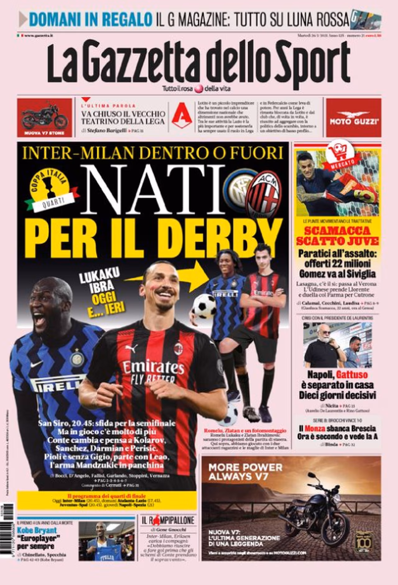 Questo è l’argomento principale trattato sulla prima pagina della Gazzetta dello Sport oggi in edicola. In casa nerazzurra Conte pensa a diversi cambi per centrare la semifinale: dentro probabilmente Kolarov, Sanchez, Darmian e Perisic. Pioli deve invece fare i conti con l’indisponibilità per squalifica di Gigio Donnarumma e rilancia Leao dal primo minuto. Panchina per Mandzukic, non al meglio fisicamente. Capitolo mercato: la Juve prepara l’offerta da 22 milioni per Scamacca, mentre l’Atalanta cede il Papu Gomez al Siviglia. L’Udinese ufficializza l’ex juventino Llorente e cede Lasagna al Verona, preparandosi poi a sfidare il Parma per Cutrone. Situazione Napoli: Gattuso si gioca il futuro della sua panchina nei prossimi dieci giorni.