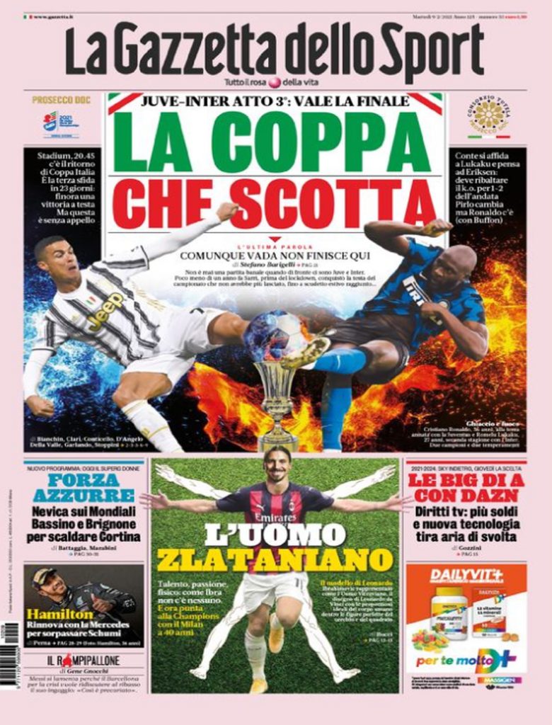 La Gazzetta apre con il titolo “La Coppa che scotta”: un anno fa Sarri, vincendo contro i nerazzurri, consolidò il primo posto in campionato prima del lockdown senza più mollarlo. Partita mai banale: Conte vuole rimontare il ko dell’andata e si affida al rientrante Lukaku, mentre Pirlo punterà ancora sull’esperienza di Cristiano Ronaldo e Gigi Buffon. Grande risalto poi, anche qui, a Zlatan Ibrahimovic. “L’uomo zlataniano” punta con decisione a riportare il Milan in Champions League (con lo scudetto sull sfondo), prima di estendere il proprio contratto che lo porterà a giocare a 40 anni inoltrati.