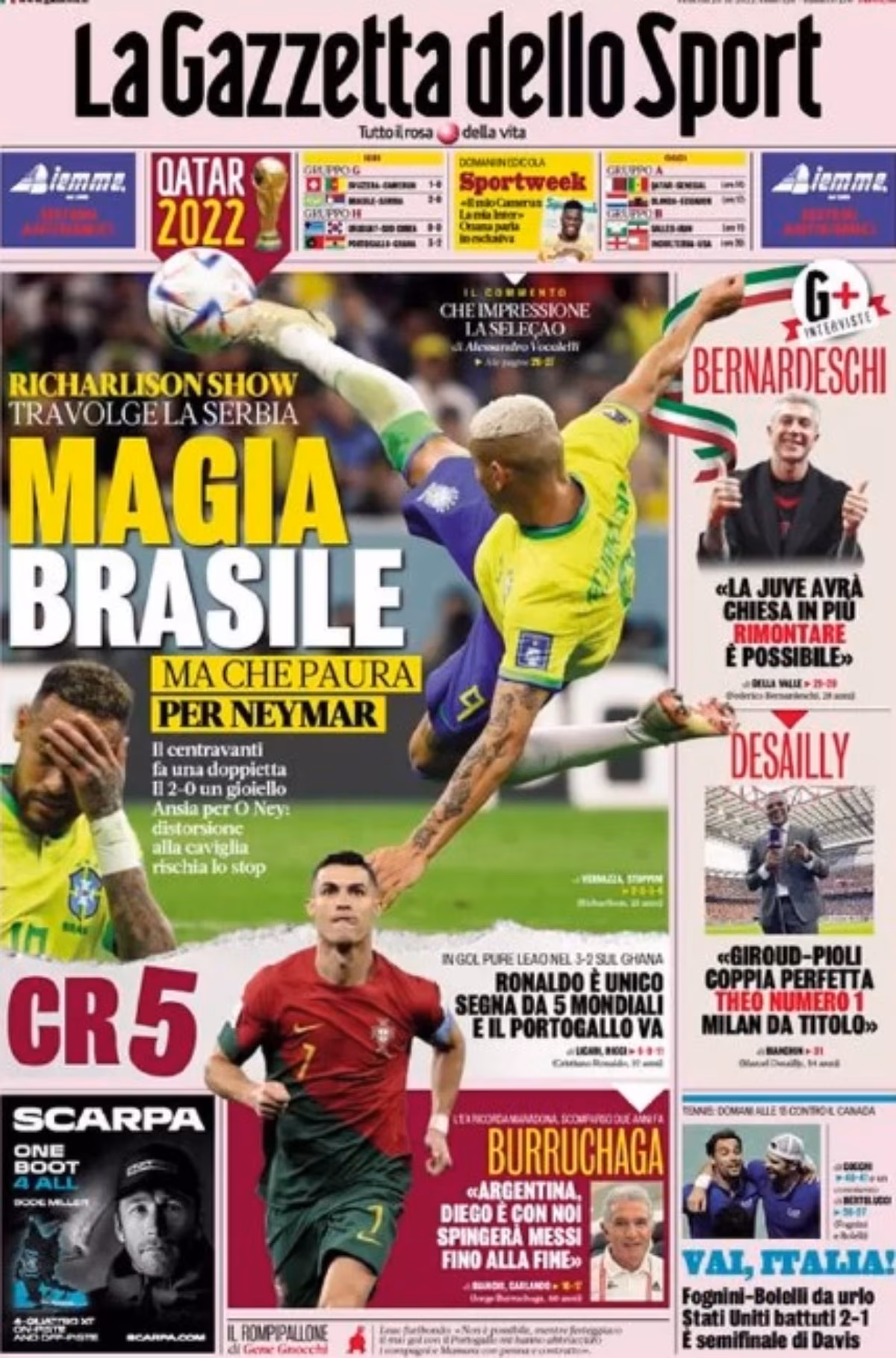 In prima pagina ampio spazio alla vittoria del Brasile sulla Serbia. Nei verdeoro titolari Danilo e Alex Sandro, nella Serbia subentrato nella ripresa Vlahovic.