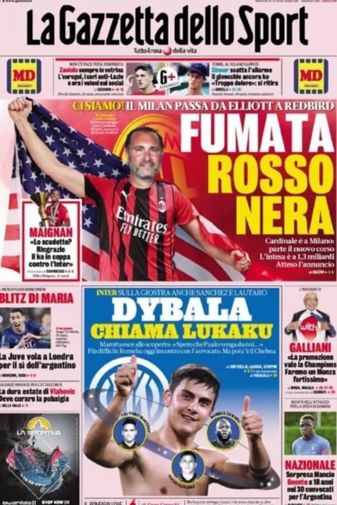 La Rosea prosegue: “La Juve vola a Londra per il sì dell’argentino“. Per un argentino a zero che viene, uno che va. Sempre in prima pagina il quotidiano titola “Dybala chiama Lukaku“, con la Joya sempre più vicina dopo le parole di ieri di Marotta.