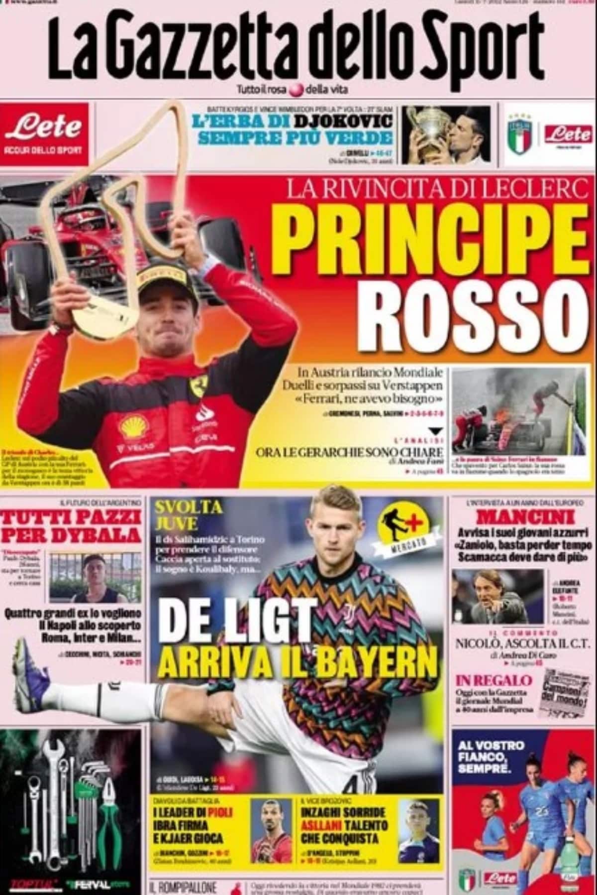 Oggi La Gazzetta dello Sport in prima pagina si concentra sulla cessione eccellente della Vecchia Signora: “De Ligt, arriva il Bayern“. Il direttore sportivo del club bavarese Hasan Salihamidzic (che ha vestito anche la maglia della Juve) è arrivato a Torino.