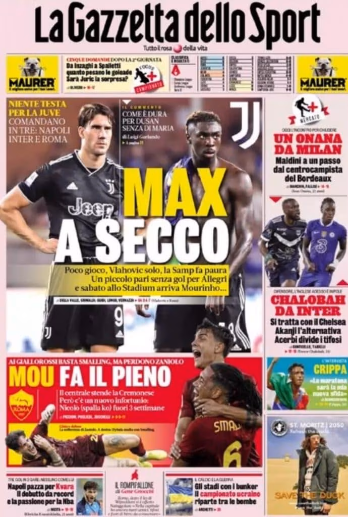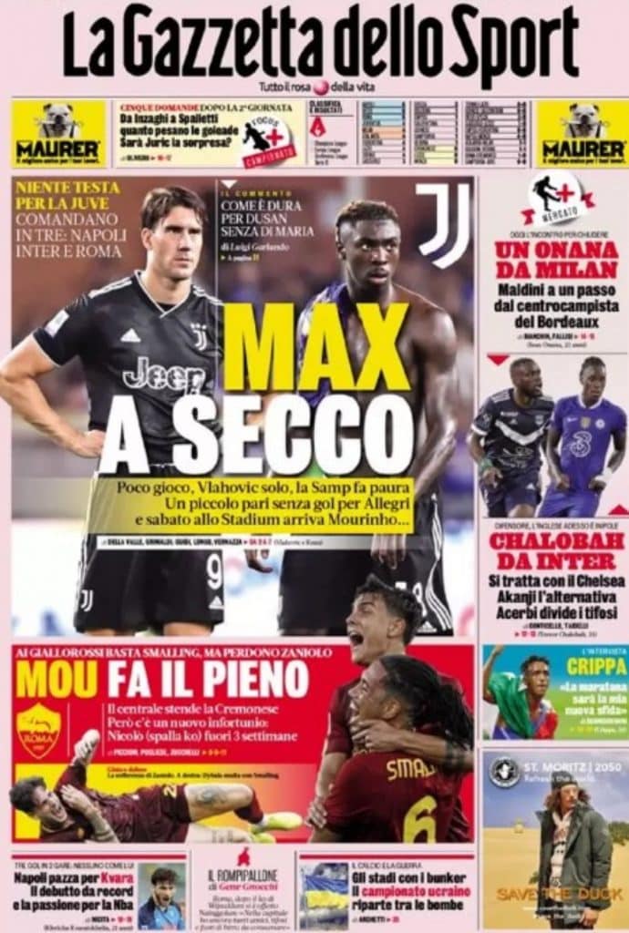 La Gazzetta dello Sport titola: “Max a secco”, sottolineando il poco gioco e la solitudine di Vlahovic. TuttoSport invece titola: “Juve, tutto qui?”, ponendo l’attenzione sulle assenze pesanti (Pogba e Di Maria su tutti) e sulla mancanza del regista. Il Corriere dello Sport infine rincara la dose: “Non è Juve”, ponendo l’accento su una squadra da correggere, che si è affidata ai giovani nel finale.