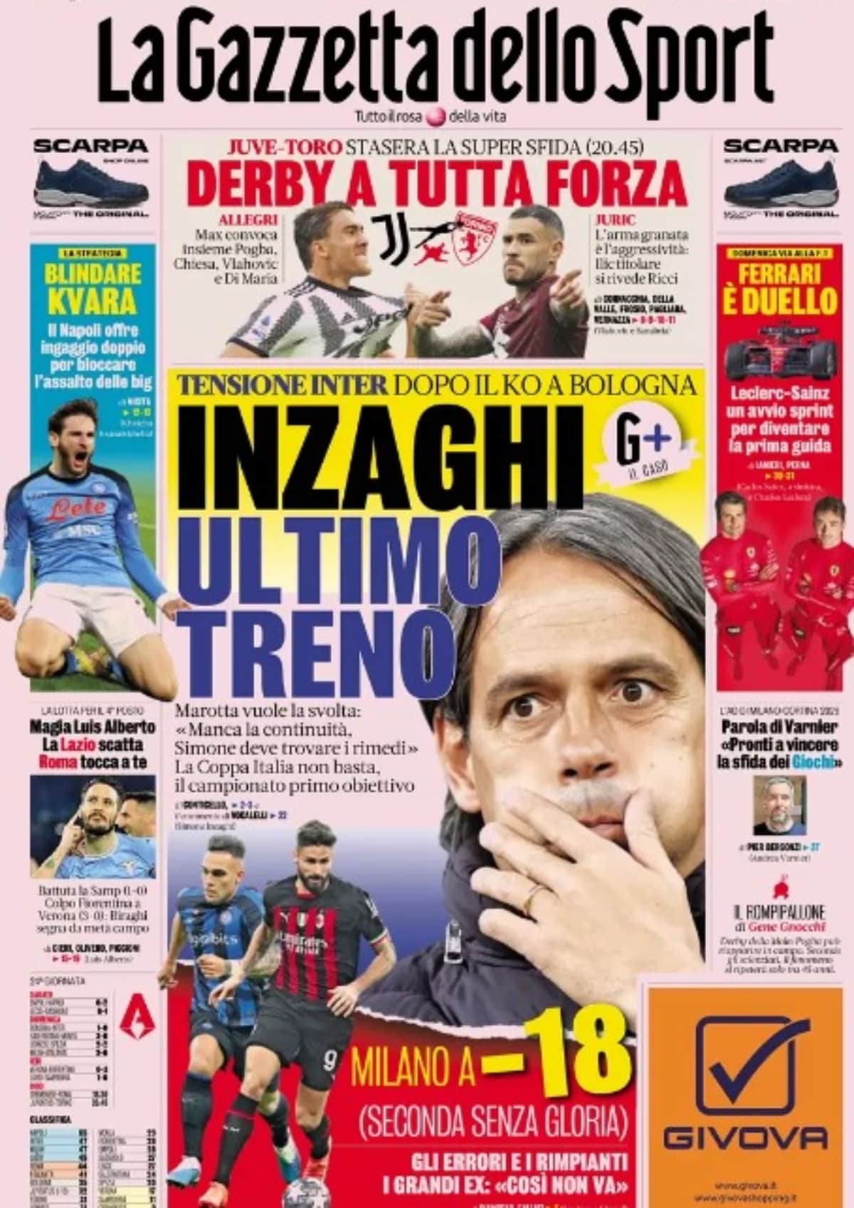 La Gazzetta dello Sport oggi in prima pagina dedica uno spazio al Derby della Mole tra Juventus e Torino. Il titolo recita: “Derby a tutta forza“.