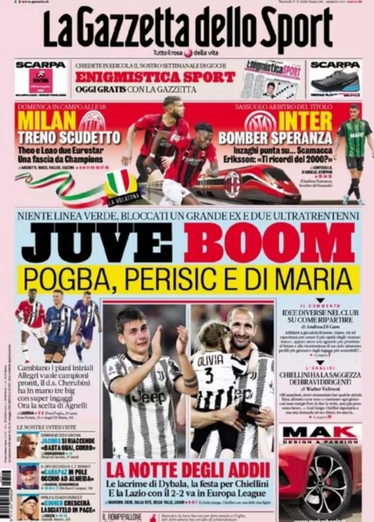 Intanto La Gazzetta dello Sport lancia la bomba di mercato. Il quotidiano oggi in prima pagina titola: “Juve Boom. Pogba, Perisic e Di Maria“. Secondo la Rosea quindi è cambiata la strategia: “Niente linea verde, bloccati un grande ex e due ultratrentenni“.