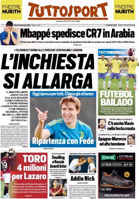 Oggi in prima pagina Tuttosport si concentra sulle vicende giudiziarie: “L’inchiesta si allarga“. I faldoni dell’inchiesta di Torino arrivano alle Procure di Bergamo e Genova.