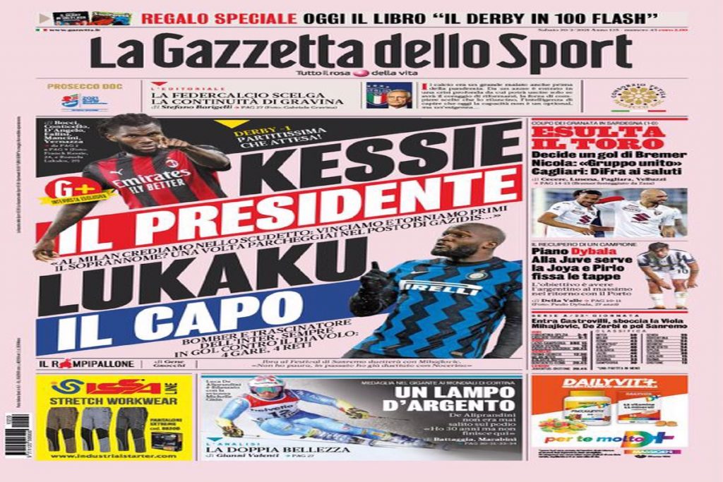 TORINO – [fncvideo id=656489 autoplay=true] La prima pagina dell’edizione odierna de La Gazzetta dello Sport intitola così: “Kessie il presidente, Lukaku il capo”. Il riferimento è all’intervista esclusiva al centrocampista rossonero in vista del derby di Milano che andrà in scena domani alle 15. In prima pagina spazio anche al posticipo di ieri sera tra Cagliari e Torino: la squadra di di Nicola ha vinto il match negli ultimi minuti grazie ad un gol di testa del difensore Bremer ed ha condannato i sardi alla sconfitta. Sconfitta che potrebbe costare caro a mister Eusebio Di Francesco che sarebbe sempre più in bilico, nonostante il recente rinnovo di contratto fino al 2023. Ieri alle 18 si è giocato anche un altro match di campionato tra Fiorentina e Spezia. I viola hanno vinto 3-0 grazie alle reti di Vlahovic, Eysseric e Castrovilli. In prima pagina c’è anche un trafiletto dedicato a Paulo Dybala, che è ancora ai box per un infortunio e deve riscattare questa stagione piena di brutte prestazioni non alla sua altezza. La sua qualità servirà sicuramente al tecnico Andrea Pirlo in questa seconda metà di stagione.