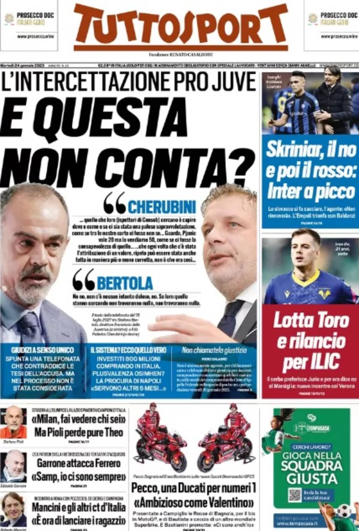 TuttoSport oggi dedica lo spazio principale della prima pagina alla difesa del club bianconero. Il titolo: “L’intercettazione pro Juve. E questa non conta?“.