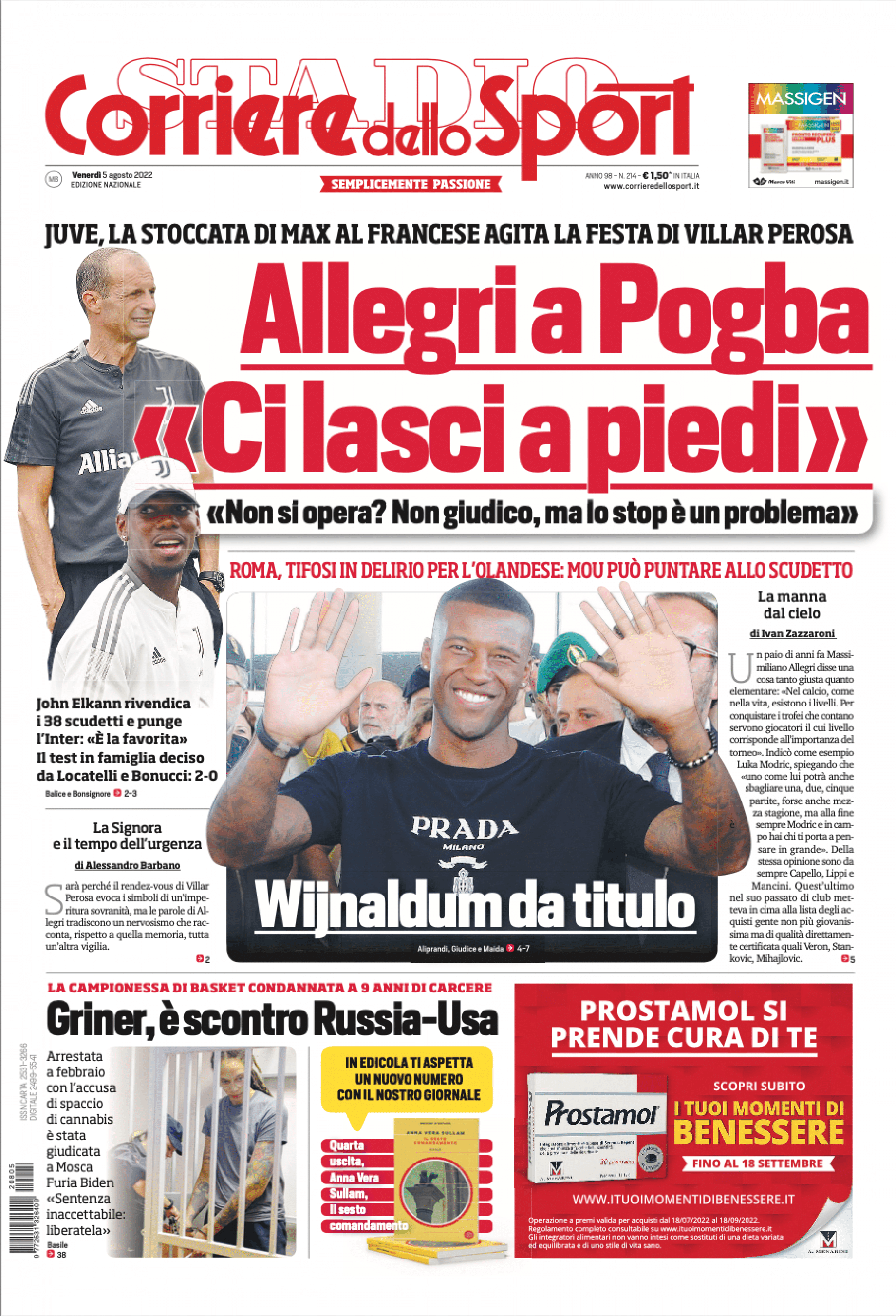 Prima pagina Corriere dello Sport 5 agosto 2022