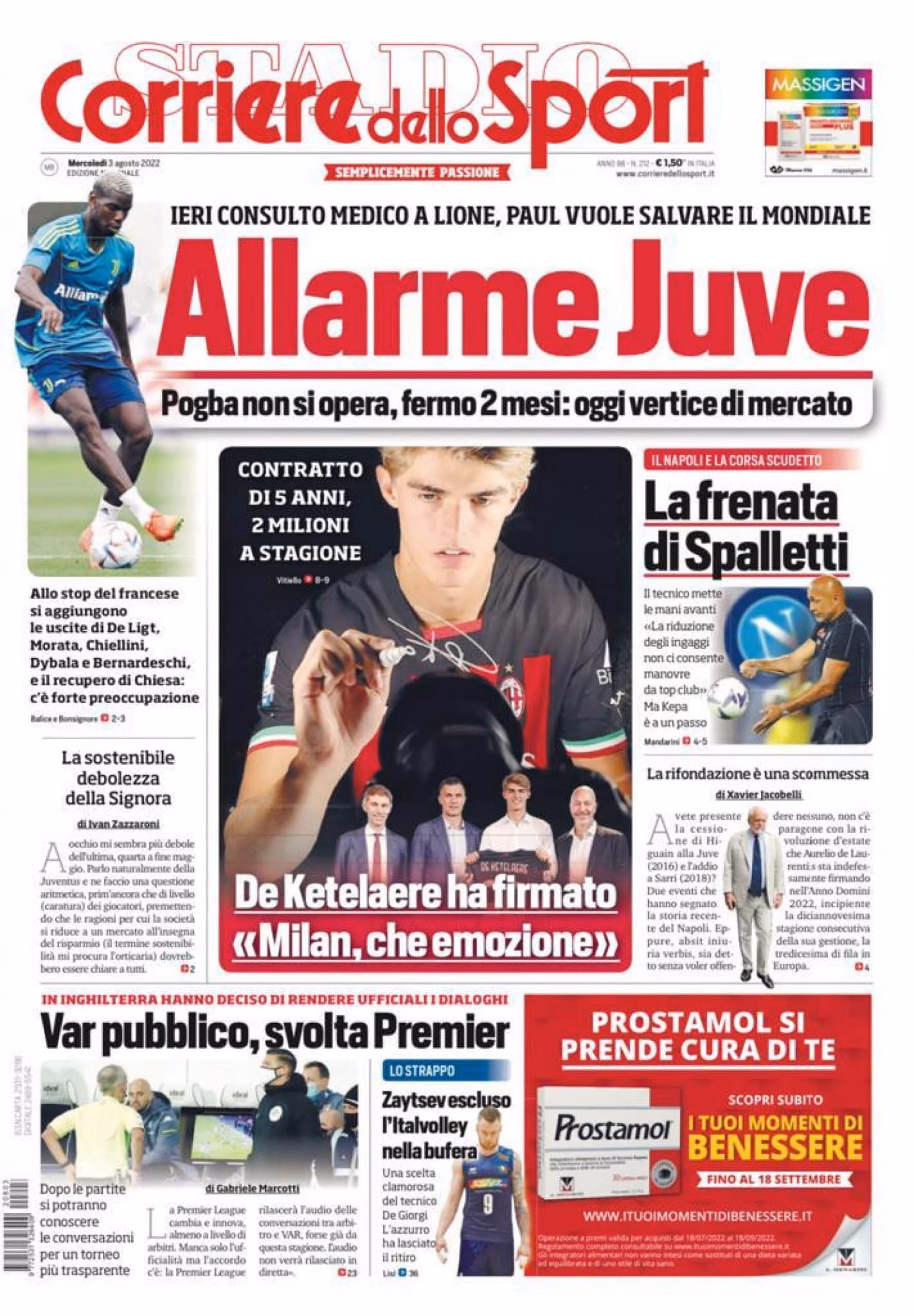 Il Corriere dello Sport titola con “Allarme Juve”, riferendosi a Pogba ed al suo stop, visto che oggi è arrivata la decisione dopo giorni di tentennamento.