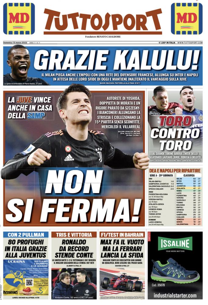 Tuttosport invece titola con “Non si ferma”, in riferimento sia alla Juventus che ad Alvaro Morata, autore di una doppietta nella partita di ieri contro la Sampdoria.