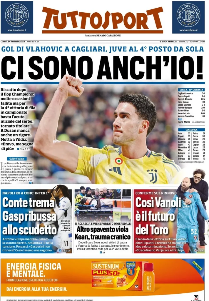 Il Corriere dello Sport in prima pagine parla della vittoria esterna dei bianconeri, con il ritorno al gol di Vlahovic, assoluto protagonista della gara ieri, con la rete, un assist non sfruttato da Yildiz e un rigore dubbio non concesso dal direttore di gara. Tuttosport invece, mette il punto sulla corsa Champions, con lo scatto decisivo dei bianconeri, pronti ad un finale di stagione importante per provare a salvare una stagione per ora molto deludenti in più ambiti. Intanto ecco le parole di Thiago Motta dopo Cagliati-Juve<<<