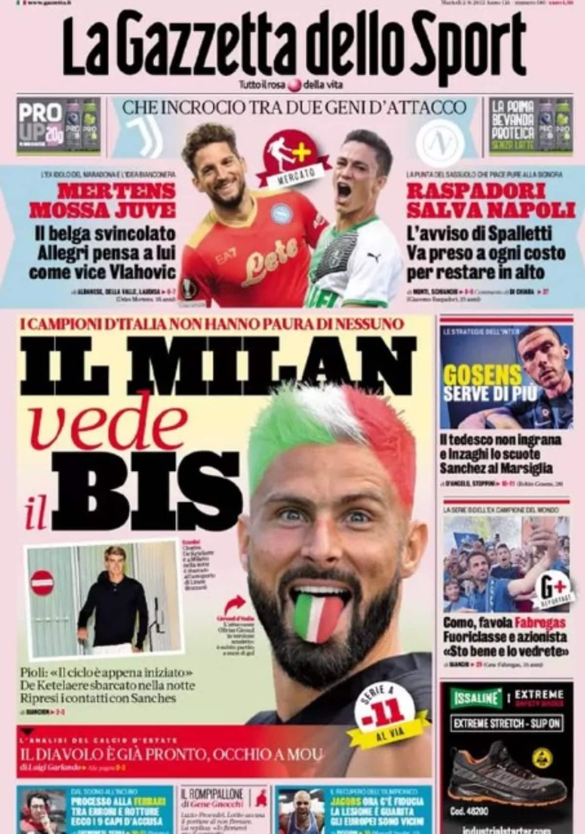 Oggi La Gazzetta dello Sport in prima pagina si occupa dei destini incrociati di Dries Mertens e Giacomo Raspadori. Secondo la Rosea, il belga, che è rimasto dopo la scadenza del contratto con il Napoli, sarebbe l’ultima idea della Juventus come vice di Dusan Vlahovic.