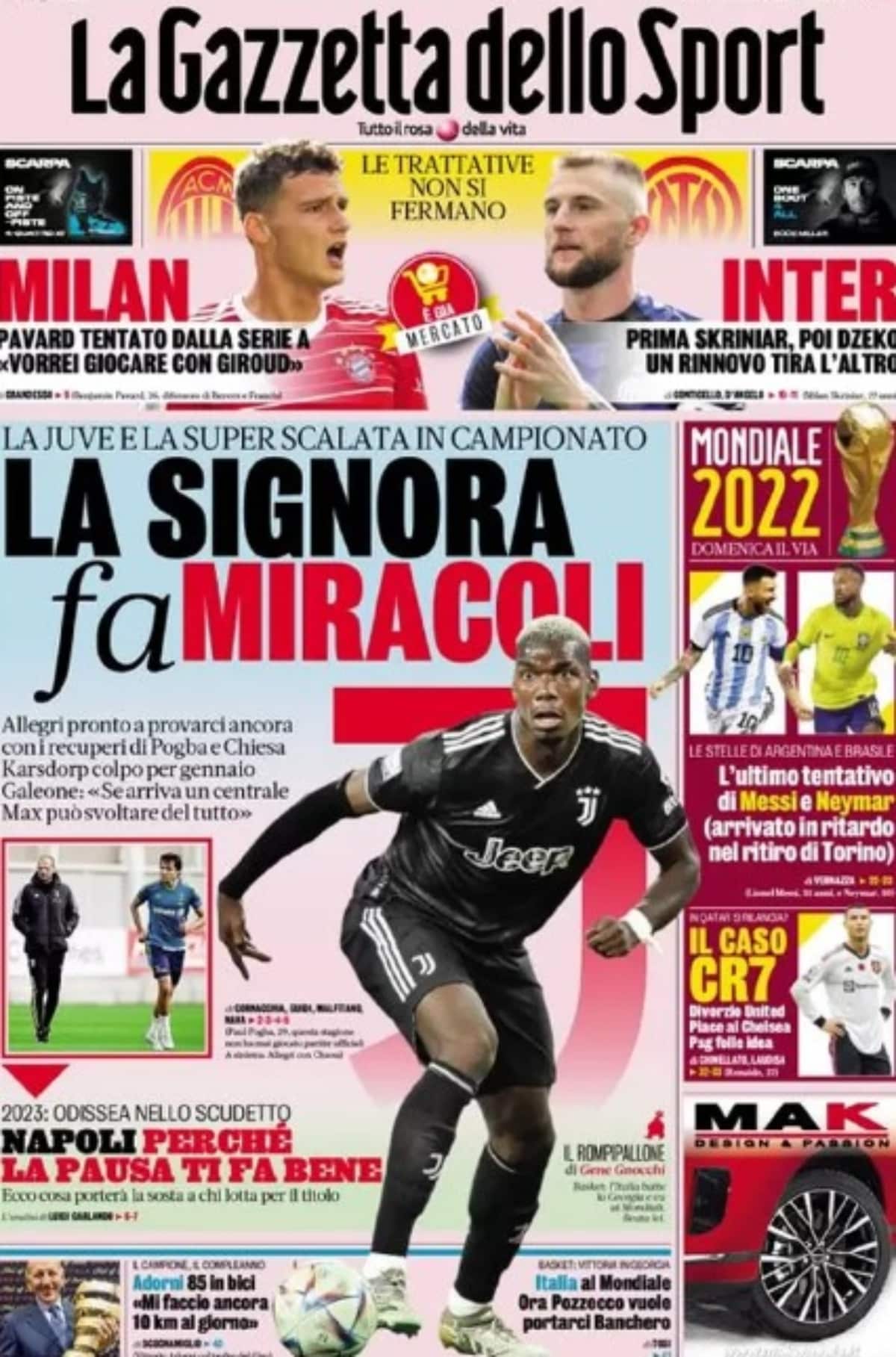 Oggi La Gazzetta dello Sport in prima pagina titola: “La Signora fa miracoli. La Juve e la super scalata in campionato“, dedicandosi al tentativo di rimonta verso il Napoli capolista, a partire da gennaio.