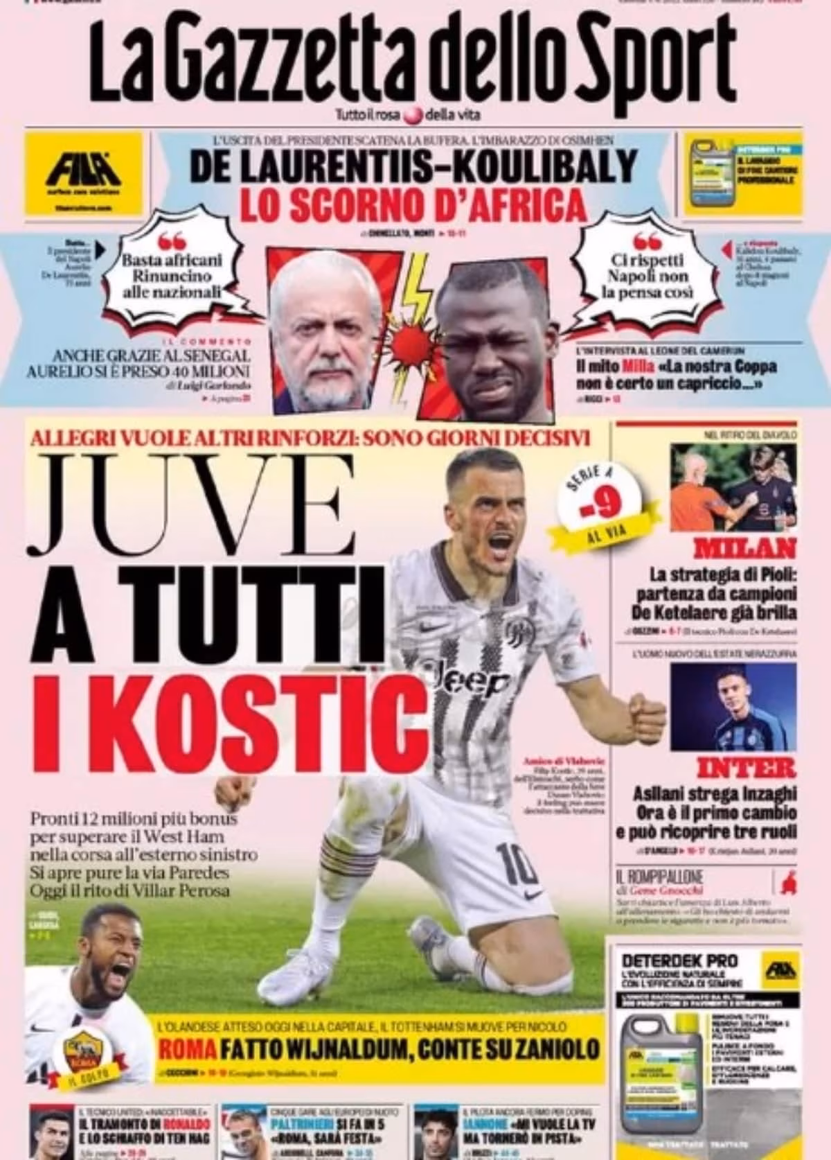 Allegri nell’incontro con la dirigenza ha chiesto alcuni rinforzi fondamentali per completare la rosa. E uno di questi è certamente Filip Kostic. L’esterno serbo è oggi protagonista sui quotidiani sportivi come obiettivo primario della Juve.