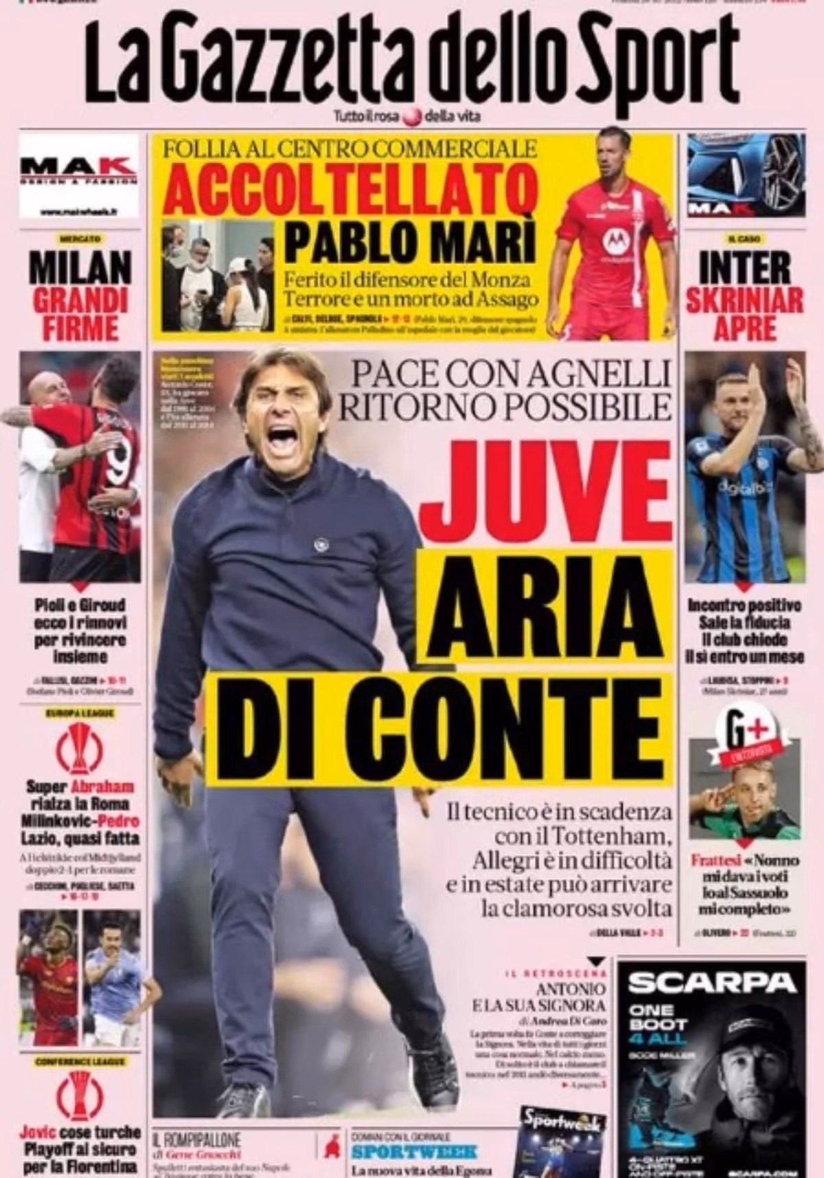Oggi La Gazzetta dello Sport dedica la prima pagina proprio al possibile cambio in panchina, titolando: “Juve, aria di Conte“. Secondo la Rosea, il tecnico avrebbe fatto pace con il presidente Agnelli e sarebbe pronto a tornare.