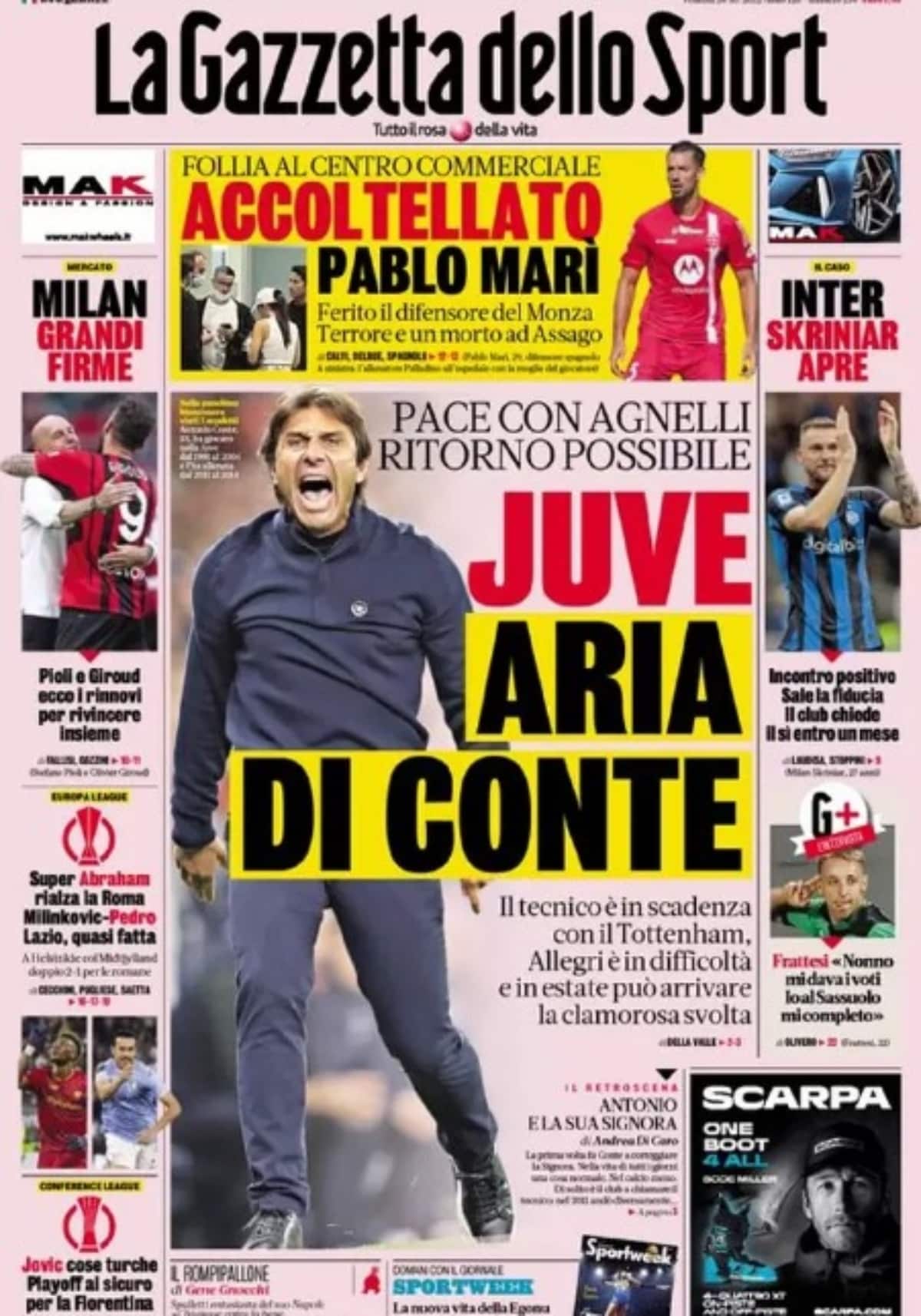 Oggi La Gazzetta dello Sport dedica la prima pagina proprio al possibile cambio in panchina, titolando: “Juve, aria di Conte“. Secondo la Rosea, il tecnico avrebbe fatto pace con il presidente Agnelli e sarebbe pronto a tornare.