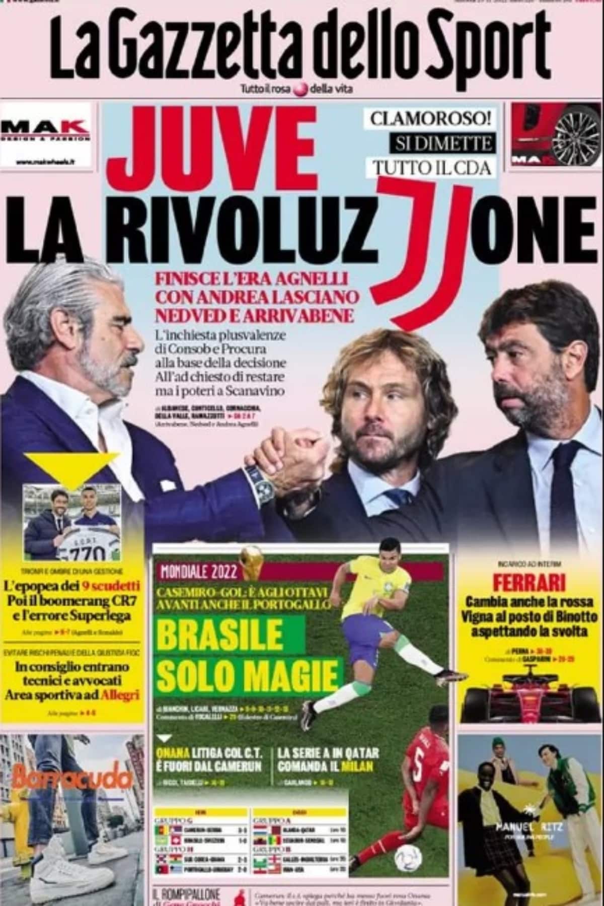 La notizia delle dimissioni del CdA domina le prime pagine dei quotidiani sportivi. La Gazzetta dello Sport oggi titola: “Juve, la rivoluzione“, proseguendo: “Finisce l’era Agnelli. Con Andrea lasciano Nedved e Arrivabene”.