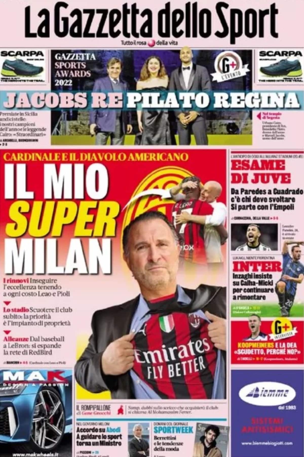 In taglio alto il giornale parla di Superlega, con un’intervista al nuovo ad Bernd Reichart: “La Superlega si farà. Serve una riforma, tutti lo sanno. Format aperto, senza posti fissi”. Ma Spagna e Germania insorgono. Ma parlando di mercato, raffica di notizie folli: addio Di Maria, nuova proposta per Milinkovic<<<