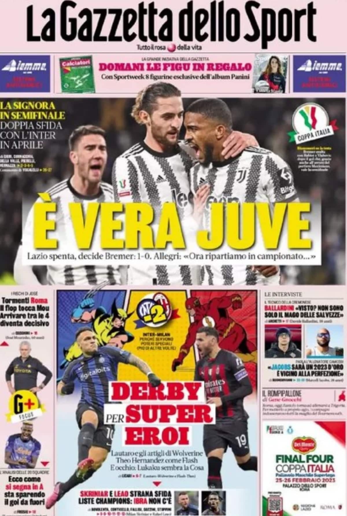 Oggi in prima pagina La Gazzetta dello Sport celebra la squadra bianconera dopo la vttoria con la Lazio. Questo il titolo: “È vera Juve“.