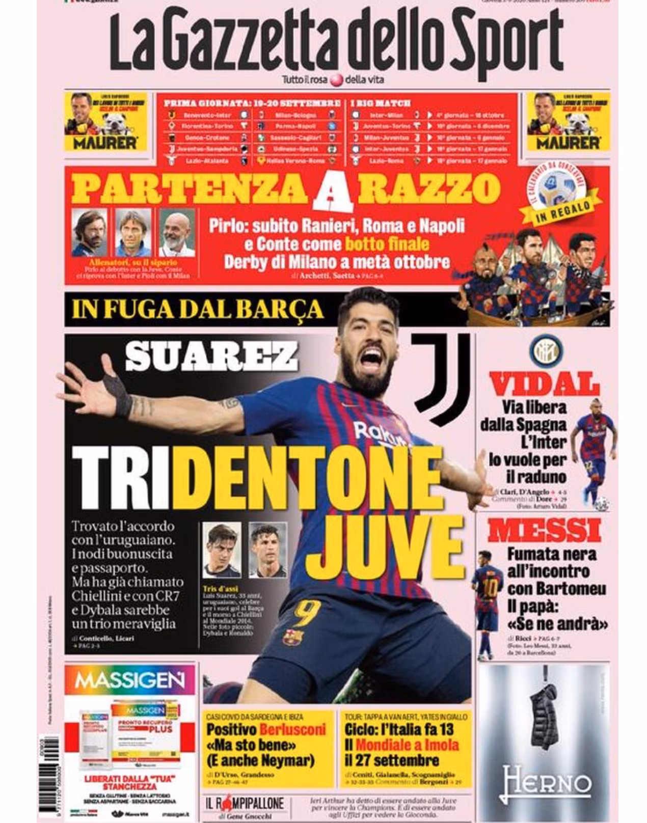 La parte centrale è sempre dedicata ai bianconeri e alle loro mosse di mercato: “Tridentone Juve: Suarez in fuga dal Barcellona” avrebbe trovato l’accordo con i bianconeri con gli ultimi nodi da sciogliere legati a buonuscita e passaporto. Il giocatore avrebbe già chiamato Chiellini e con Dybala e Ronaldo formerebbe un grande tridente.