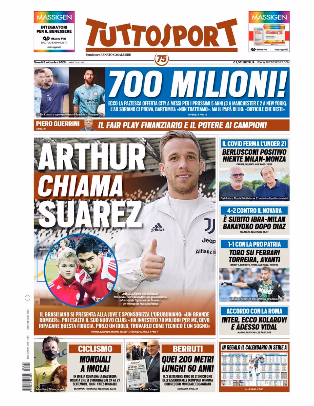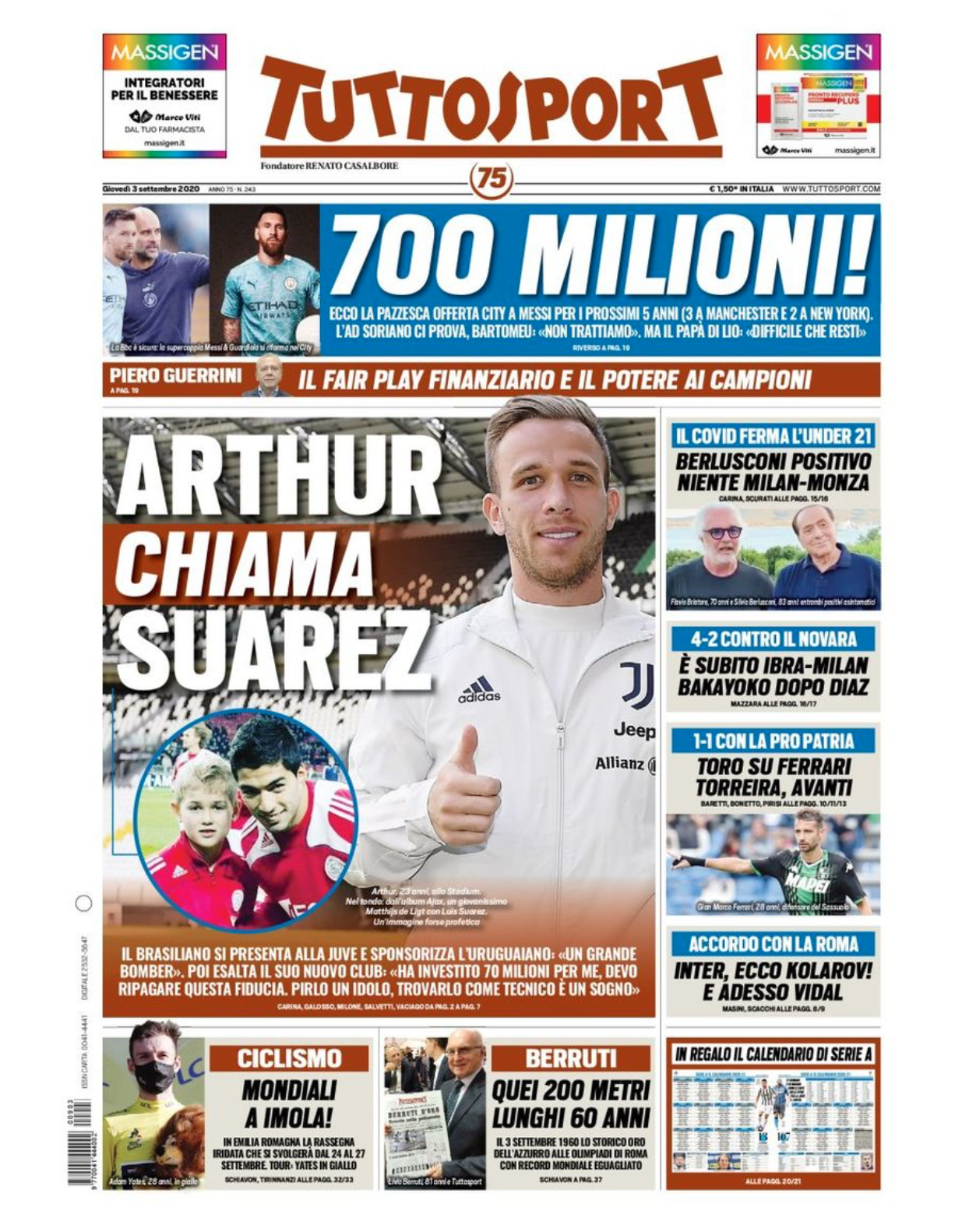 La parte centrale è dedicata al centrocampista della Juventus Arthur che ha parlato ieri in conferenza stampa esaltando il suo nuovo club e tessendo le lodi del suo ex compagno Luis Suarez, che la Juventus sta seguendo.