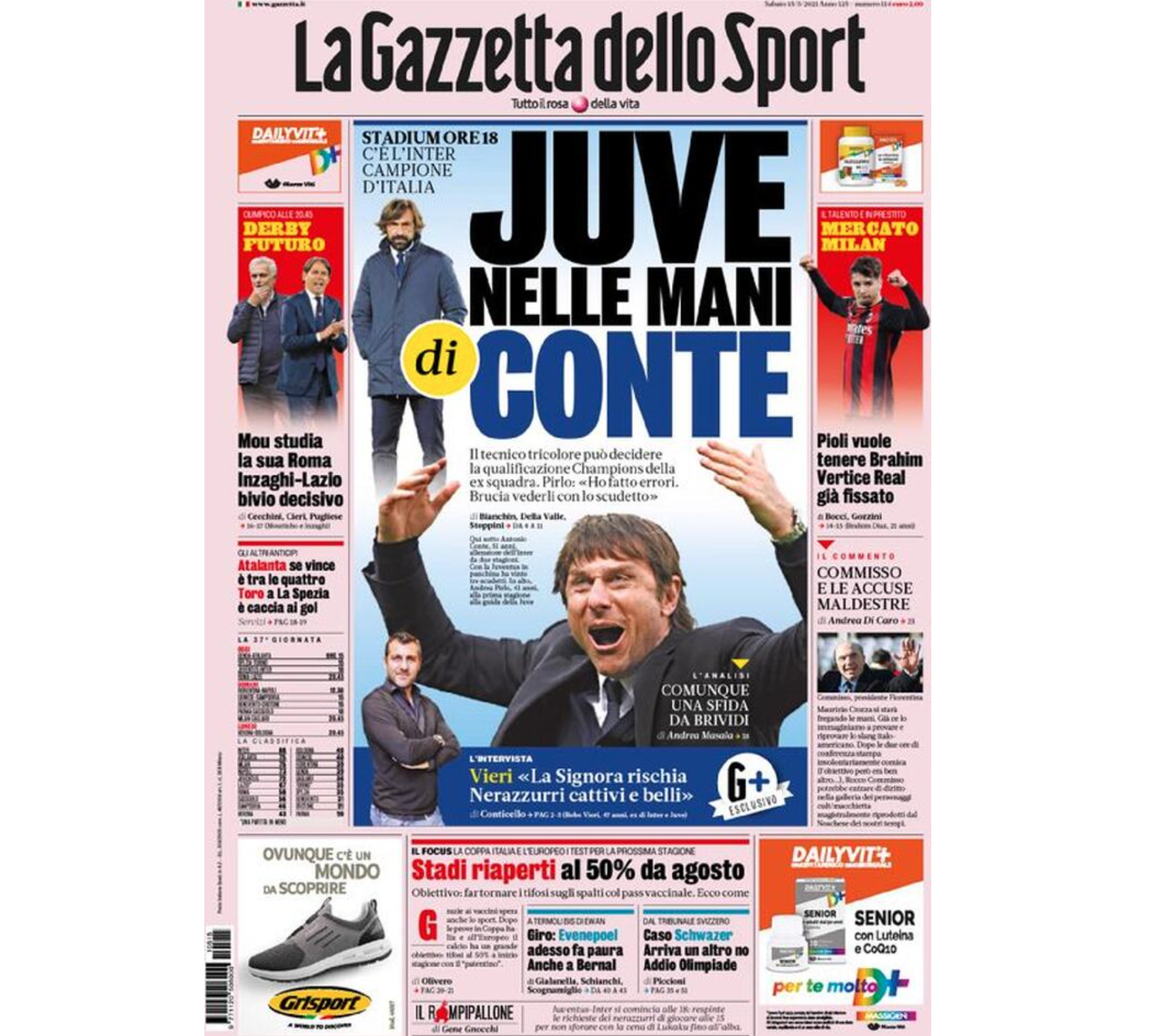 La prima pagina de La Gazzetta dello Sport in edicola apre con la supersfida dello Stadium: “Juve nelle mani di Conte. Stadium ore 18 c’è l’Inter campione d’Italia”.